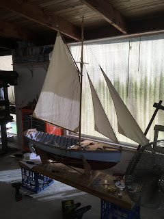 Because the model will be heavy I've been working on a trolley to move it around. I will need ramps to get it up and down onto the work bench and into my vehicle. Here it is raised up so I can work on it. The mast will need to be lowered when moving the boat on the trolley and there is barely enough room to raise the mast under the workshop ceiling!